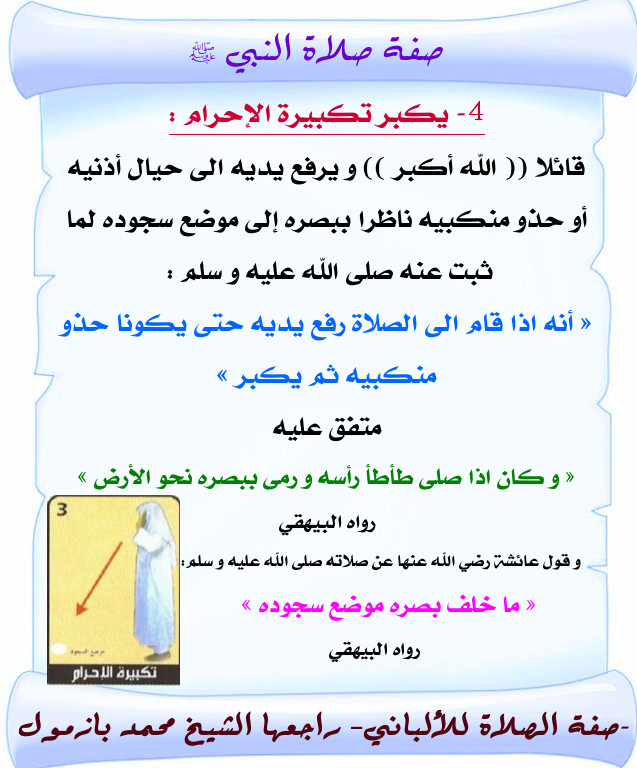 كتاب ي بي ن كيف كان النبي صلى الله عليه وسلم ي صل ي بذكر أحاديث صفة صلاته عليه الصلاة والسلام مع بيان صحتها من ضعفها. لأنه يجب على المصلي أن ينوي الصلاة التي سوف يقيمها وان محل النية القلب ولا اكون بالتلفظ. 16 وتجوز صلاة الإمام على مكان مرتفع كالمنبر لتعليم الناس يقوم عليه فيكبر ويقرأ ويركع وهو عليه ثم ينزل القهقرى حتى يتمكن من السجود على الأرض في أصل المنبر ثم يعود إليه فيصنع في الركعة الأخرى كما صنع في الأولى. صفة صلاة النبي صل الله عليه وسلم.