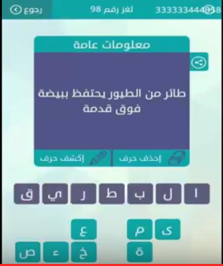 اجابة لغز طائر من الطيور يحتفظ ببيضة فوق قدمه من لعبة وصلة المجموعة الحادية عشرة لغز رقم 98 صقور الإبدآع