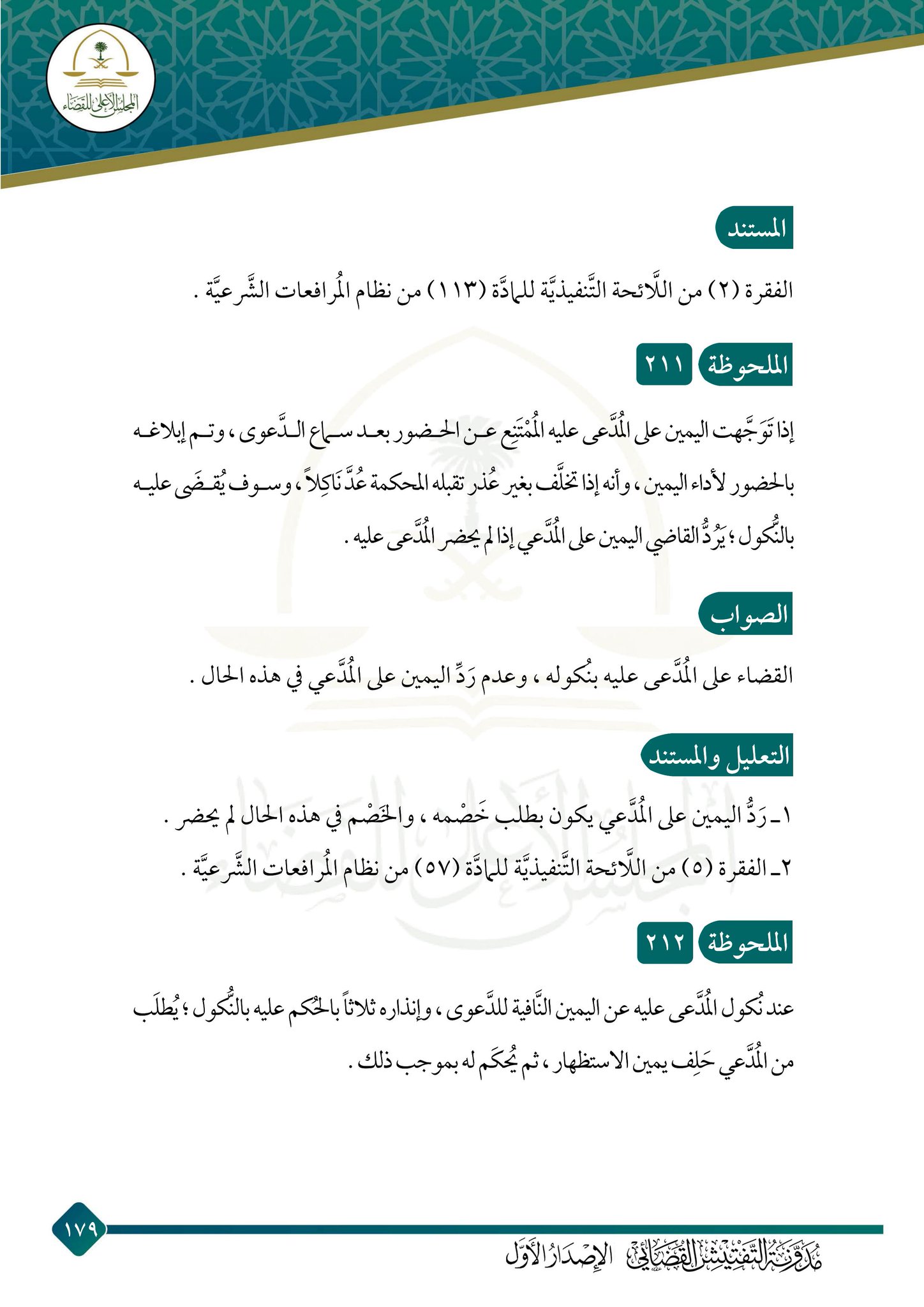 طلب اليمين من المدعى عليه. 3 إذا أقام المدعي شاهدا وعجز عن تقديم شاهد آخر فله أن يحلف مع الشاهد في الأموال وما يؤول إلى الأموال ما عدا القصاص والحدود. وفيه ان المدعى عليه لا يحلف إلا اذا طلب القاضي منه ذلك بناء على طلب المدعى. 1 أنه لا يحكم لأحد بمجرد دعواه. وهنالك قول ثالث ذهب إليه أهل الظاهر وهو أن اليمين لا ترد على المدعي وأن النكول لا يقضى به في أي شيء والمدعى عليه إما أن يقر بحق المدعي وإما أن ينكر ويحلف على براءة ذمته ورجح الشوكاني هذا الرأي وقال.
